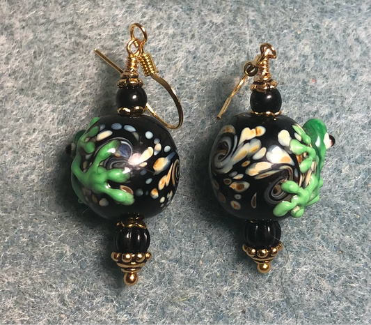 Green and black lamp work frog bead earrings adorned with green Czech glass beads.