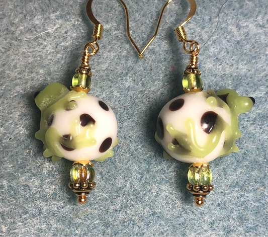 Brown and green lamp work frog bead earrings adorned with green Czech glass beads.