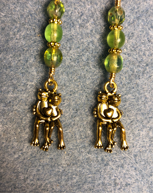 Gold pair of hugging frog charm earrings adorned with lime green Czech glass beads