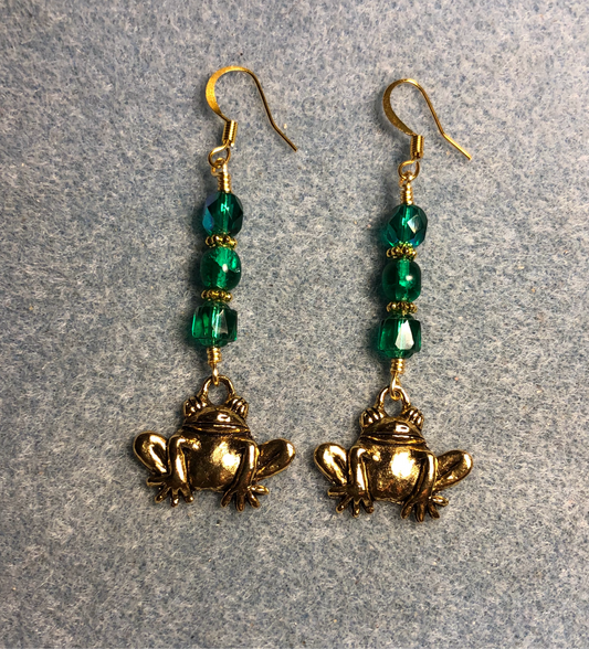 Gold Tierracast frog charm earrings adorned with emerald green Czech glass beads