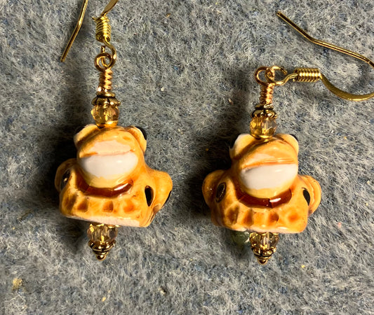 Small amber and black ceramic spotted frog bead earrings adorned with amber Chinese crystal beads.