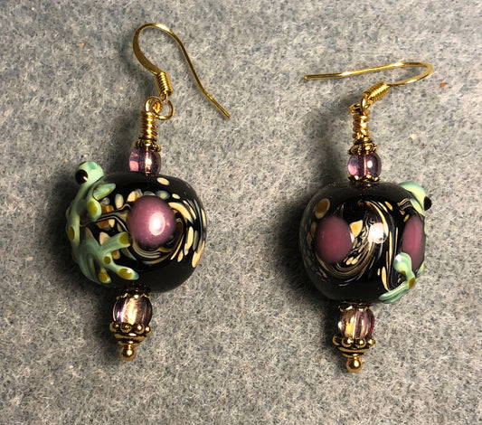 Green and purple lamp work frog bead earrings adorned with purple Czech glass beads.