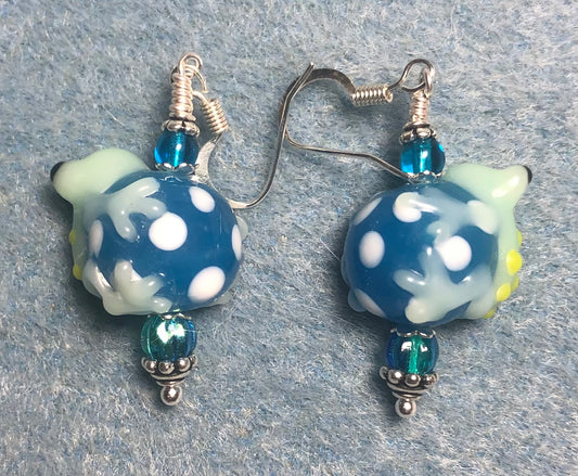 Green and light blue lamp work frog bead earrings adorned with light blue Czech glass beads.