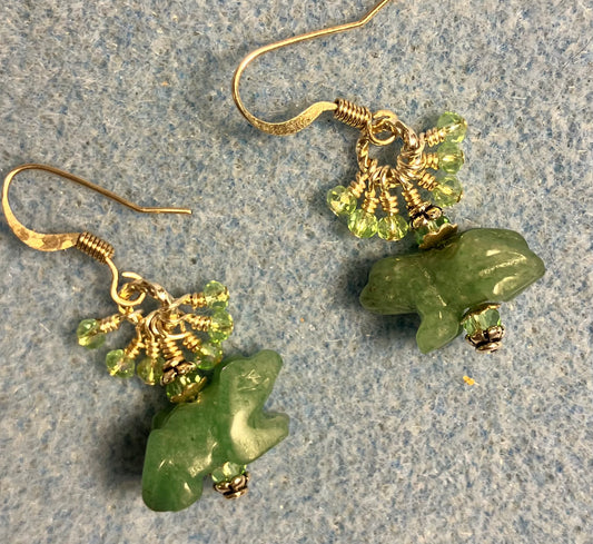 Small green aventurine gemstone frog bead earrings adorned with small green Chinese crystal beads.
