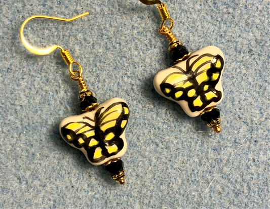 Yellow and black ceramic Monarch butterfly bead earrings adorned with black Chinese crystal beads.
