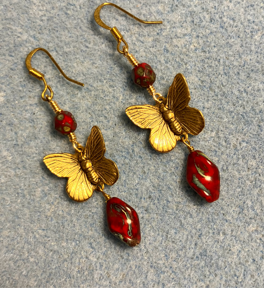 Gold butterfly charm connector earrings adorned with red Picasso Czech glass twist beads and red Picasso Czech glass beads.