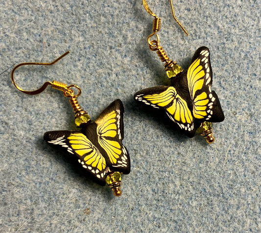 Yellow and black polymer clay butterfly bead earrings adorned with yellow Chinese crystal beads.