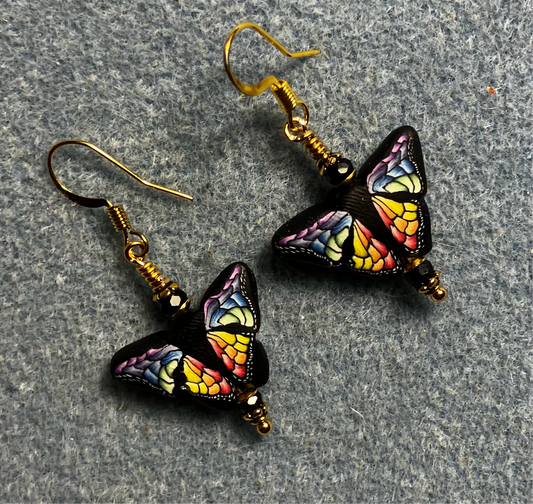 Multicolored polymer clay butterfly bead earrings adorned with black Chinese crystal beads.