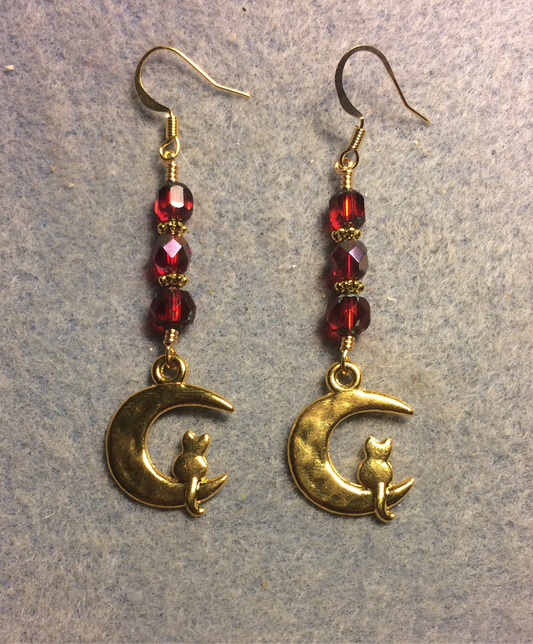 Gold cat sitting on a quarter moon charm earrings adorned with red Czech glass beads