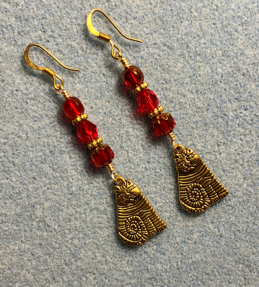 Gold sitting cat charm earrings adorned with red Czech glass beads