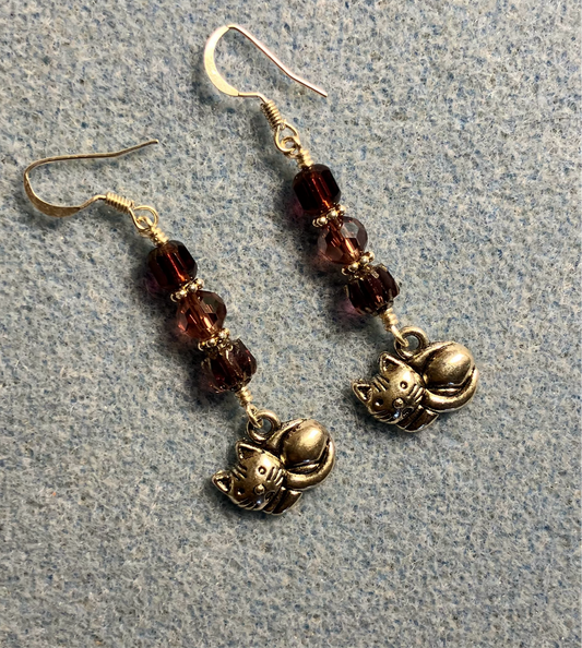 Gold cat charm earrings adorned with rose gold Czech glass beads