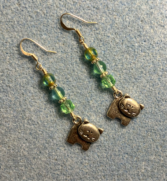 Gold swirly tail cat charm earrings adorned with teal Czech glass beads
