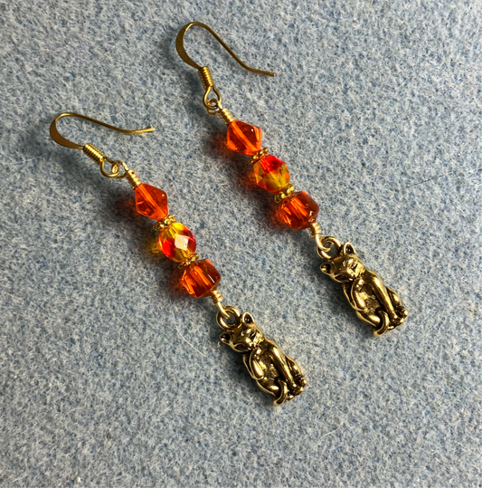 Gold cat charm earrings adorned with orange Czech glass beads