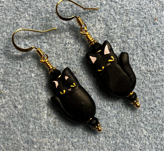 Black polymer clay cat bead earrings adorned with black Chinese crystal beads.