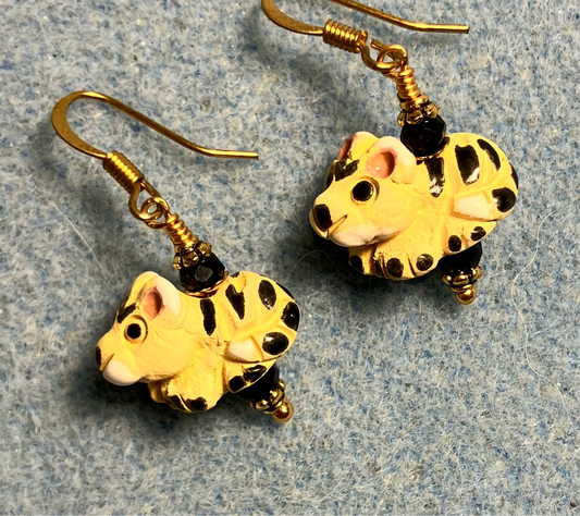 Small yellow and black ceramic exotic cat bead earrings adorned with black Chinese crystal beads.