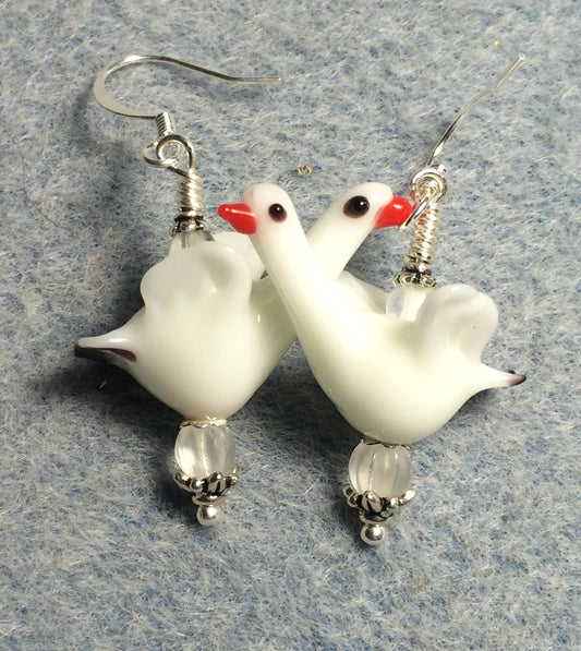 White long necked lamp work swan bead earrings adorned with clear Czech glass beads.