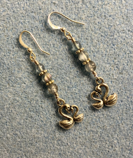 Small silver swan charm earrings adorned with small light blue Czech glass beads