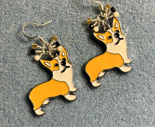 White, black, and tan enamel corgi charm earrings adorned with tiny dangling white, black, and tan Chinese crystal beads.