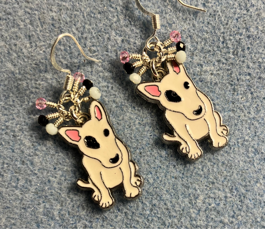 White, black, and pink enamel English bull terrier charm earrings adorned with tiny dangling white, black, and pink Chinese crystal beads.
