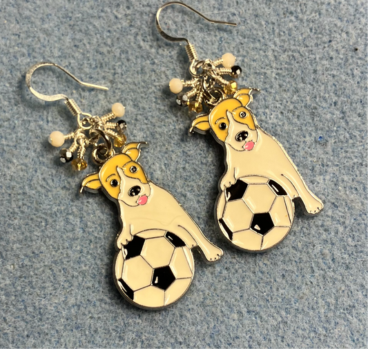 Tan and white enamel Jack Russell terrier (holding a soccer ball) charm earrings adorned with tiny dangling tan, white, and black Chinese crystal beads.