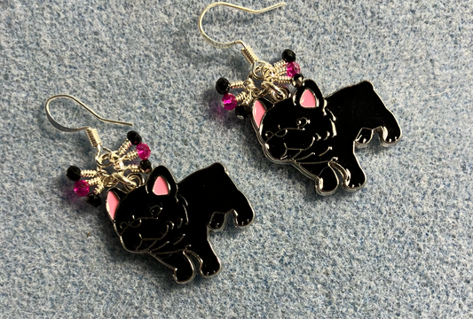 Black and pink enamel French bulldog charm earrings adorned with tiny dangling black and pink Chinese crystal beads.