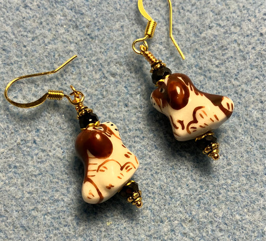 Brown and white ceramic puppy dog bead earrings adorned with brown Chinese crystal beads.