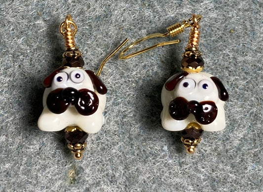 Small white and brown lamp work puppy dog bead earrings adorned with brown Chinese crystal beads.