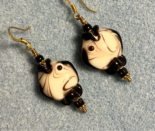 Large black and white lamp work fish bead earrings adorned with black Czech glass beads.