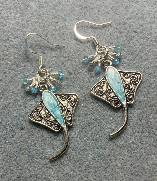 Silver and turquoise enamel stingray charm earrings adorned with tiny dangling turquoise and silver Chinese crystal beads.