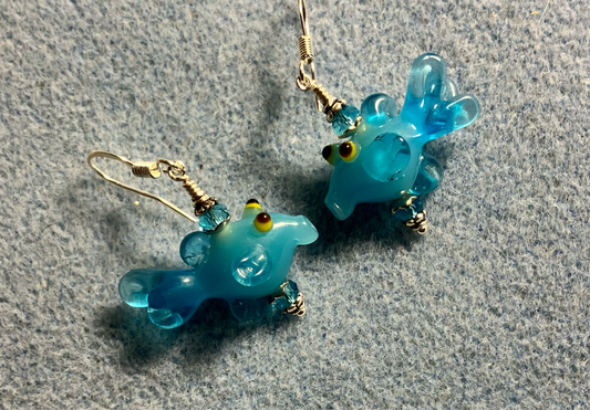 Turquoise lamp work fish bead earrings adorned with turquoise Chinese crystal beads.