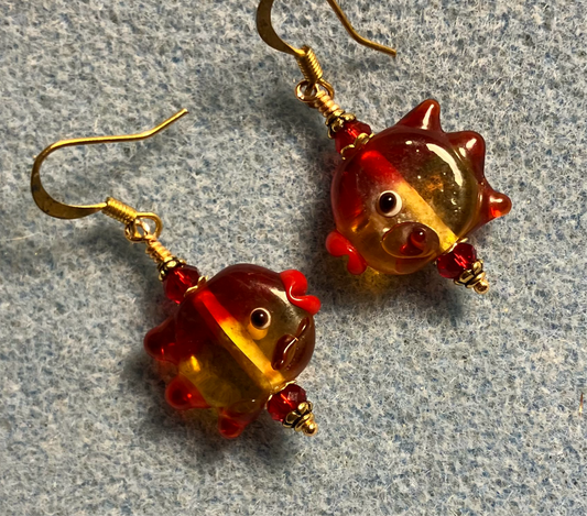 Red and amber lamp work fish bead earrings adorned with red Chinese crystal beads.