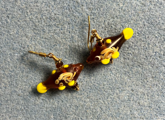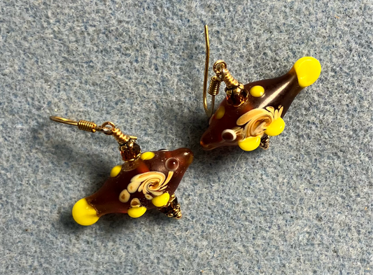 Amber lamp work fish bead earrings adorned with amber Chinese crystal beads.