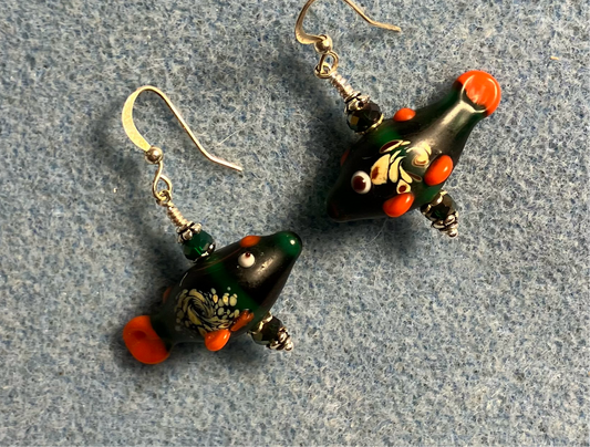 Emerald green lamp work fish bead earrings adorned with emerald green Chinese crystal beads.