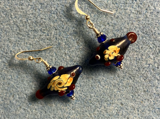 Dark blue lamp work fish bead earrings adorned with dark blue Chinese crystal beads.