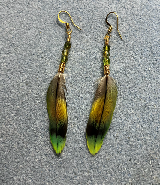 Yellow and green scarlet macaw feather earrings on gold chandelier findings adorned with tiny dangling topaz and green Czech glass beads.