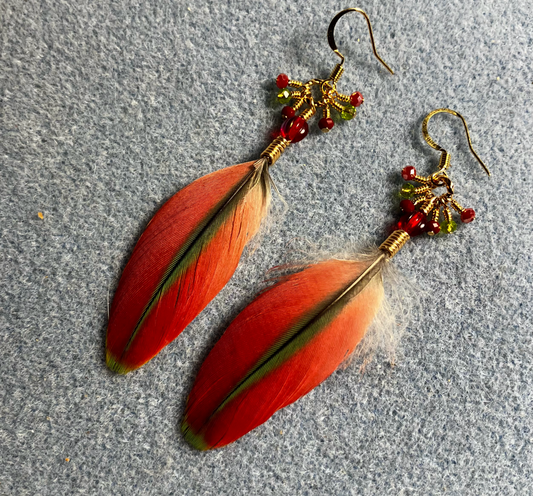 Small red and olive green Pionus feather earrings adorned with red Czech glass beads and tiny dangling red and olive green Chinese crystal beads.