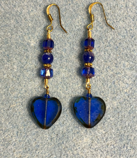 Translucent dark blue Czech glass heart bead earrings adorned with dark blue Czech glass beads.