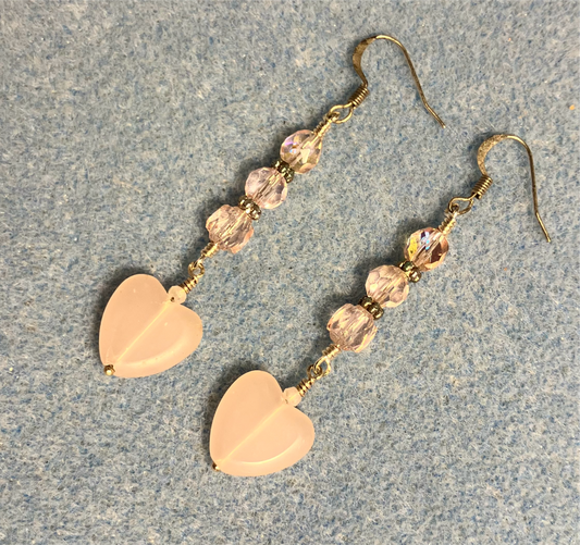 Frosty pink Czech glass heart bead earrings adorned with pink Czech glass beads.