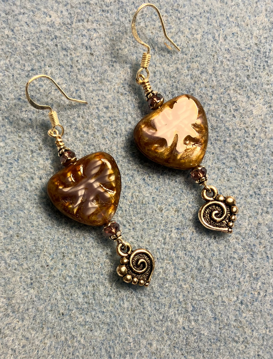 Brown Picasso Czech glass heart bead earrings made with amber Chinese crystal beads and gold Tierracast spiral heart charms.