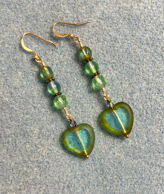 Light blue green Czech glass heart bead earrings adorned with blue green Czech glass beads.