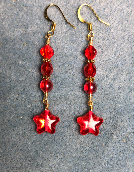 Small metallic red Czech glass star bead earrings adorned with bright red Czech glass beads.