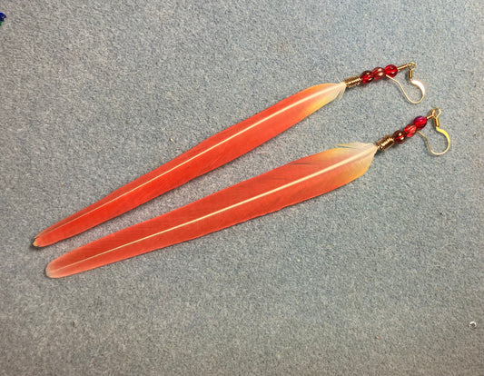 Extra long bright red sun cheeked conure feather earrings adorned with red Czech glass melon beads.