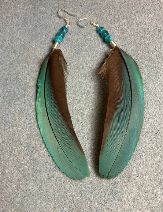 Very rare iridescent blue and green Pionus feather earrings adorned with blue and green Czech glass beads.