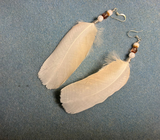 Whitish pink Moluccan cockatoo feather earrings adorned with white and pink Czech glass beads.