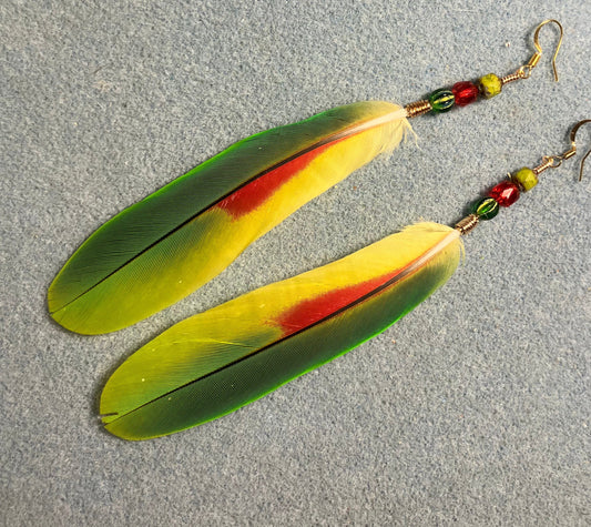 Yellow naped Amazon tail feather earrings adorned with red, yellow, and green Czech glass beads.