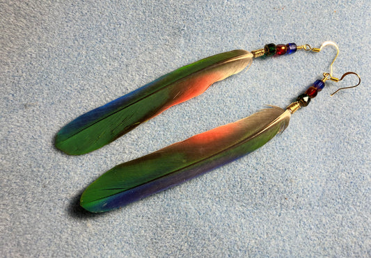 Blue, red, and green Pionus feather earrings adorned with blue, red, and green dangling Czech glass beads