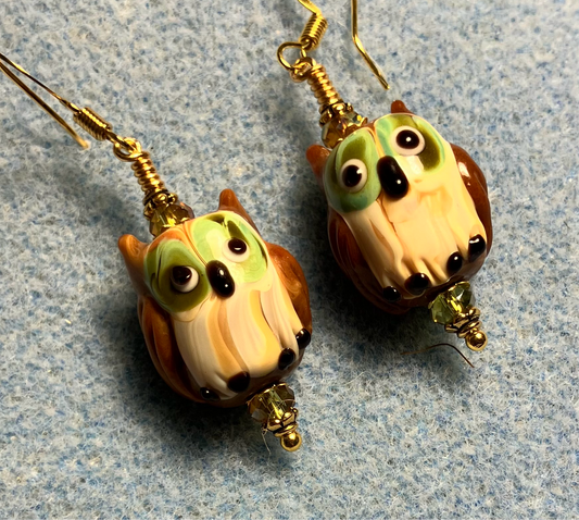 Brown and green lamp work owl bead earrings adorned with sparkly green Chinese crystal beads.