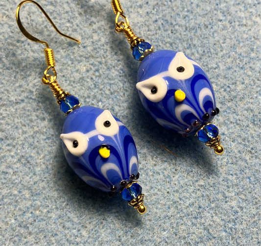 Bright blue lamp work owl bead earrings adorned with bright blue Chinese crystal beads.