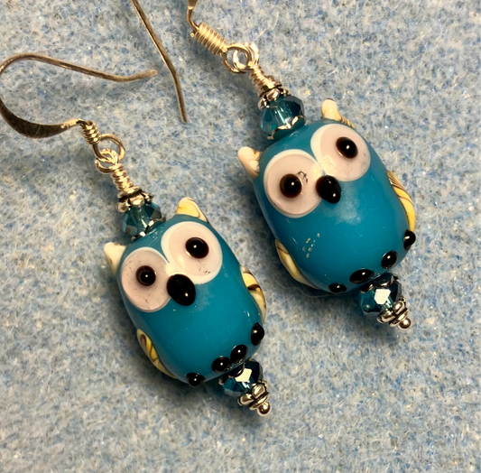 Turquoise lamp work owl bead earrings adorned with turquoise Chinese crystal beads.