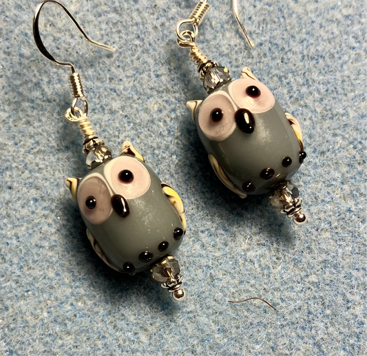 Gray lamp work owl bead earrings adorned with gray Chinese crystal beads.